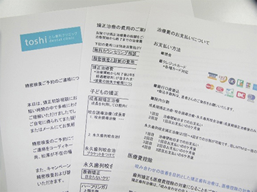 ご説明した矯正歯科治療についての資料一式をおまとめしてお帰りの際にお渡しします。