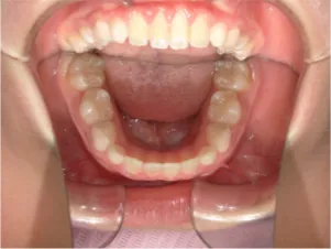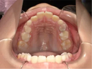 | カウンセリング・診断結果 | 下あごが後退しているタイプの出っ歯で、過蓋咬合で下あごが前に成長しにくいタイプの顔立ちです。 上の歯列弓が小さめで前歯に凸凹があります。 口元が閉じにくい口唇閉鎖不全があります。 *上記に対する治療の流れを説明し(拡大・前歯の並べ替え→出っ歯の改善→モノブロック装置(筋機能的咬合誘導装置)→必要によりマルチブラケット法)、以下の治療を提案しました。 |