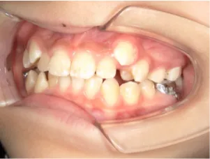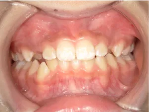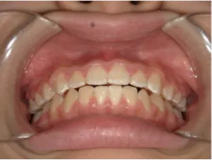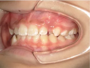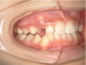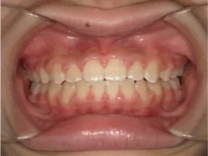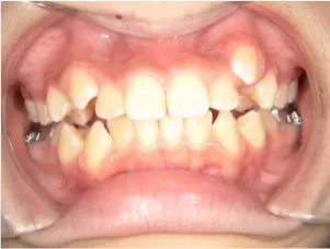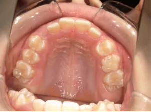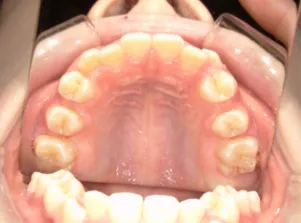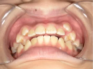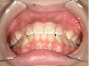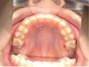 治療前①小5:生え変わり後期のため顔の成長を促進させる目的で拡大装置(アーチ形態の修正)と上顎前歯をそろえることを先行し、できるだけ非抜歯治療で進める予定を提案しました