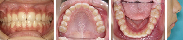 | カウンセリング・診断結果 | 骨格的な問題はないが、上下V-shaped archで永久歯の生えるスペースがなく八重歯となっている状態でした。機能的な問題として口唇閉鎖不全と低位舌が見られました。口元は特に問題はありませんでした。 治療は、歯列の拡大をおこない永久歯の萌出スペースを作り、可及的に非抜歯治療を提案しました。 |